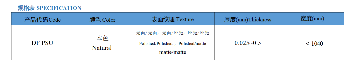 The polysulfone membrane has good transparency, with a transmittance of up to 88% for a 0.2mm thick PSU membrane. Polysulfone membrane has excellent radiation resistance and low moisture absorption.